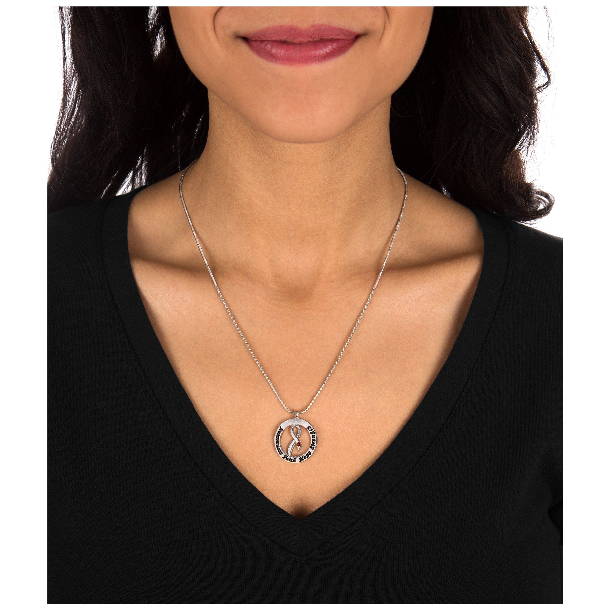 Awareness. Faith. Hope. Strength. Inspiration comes full circle on a gleaming silver-tone pendant, gracefully encircling the silver and red-marked diabetes ribbon.