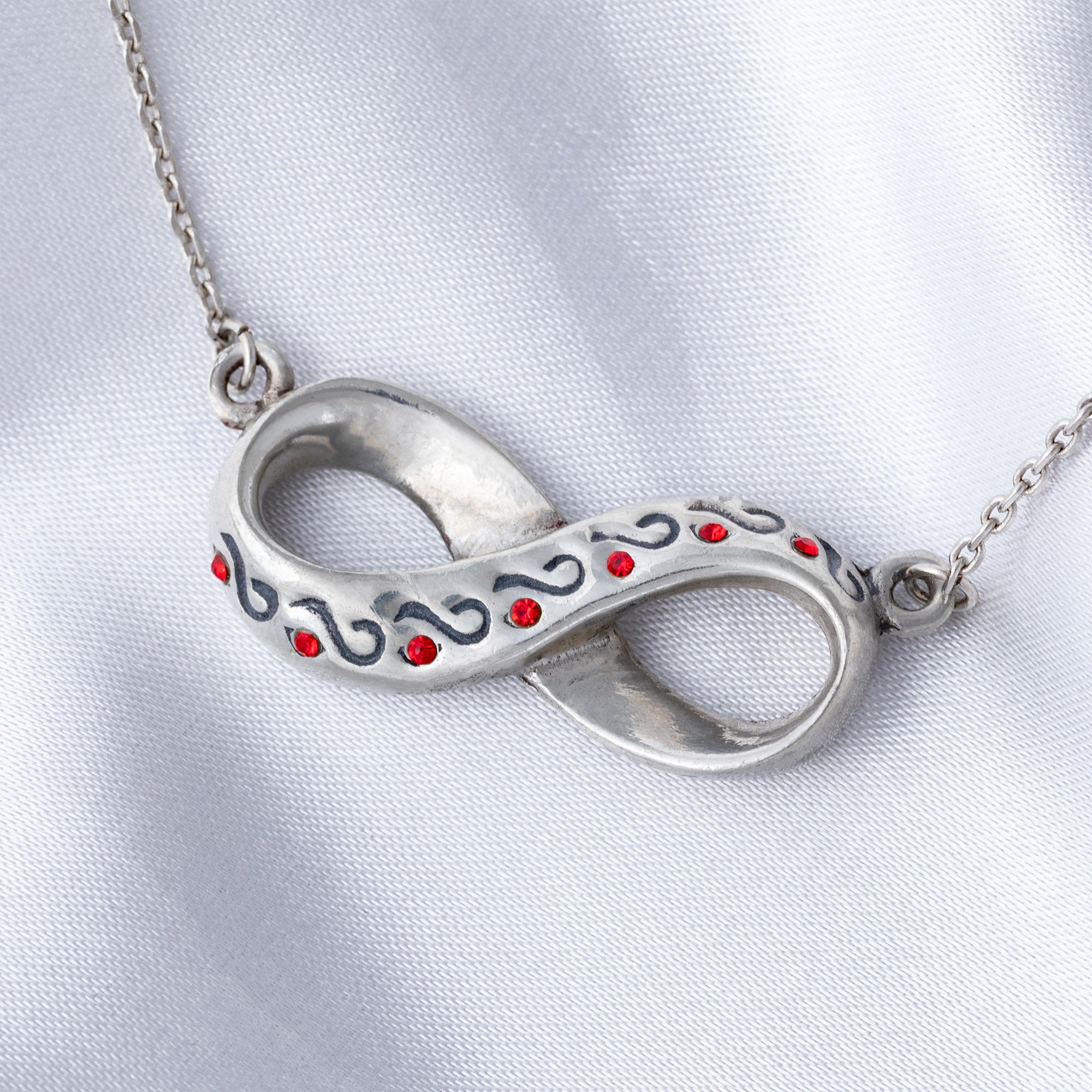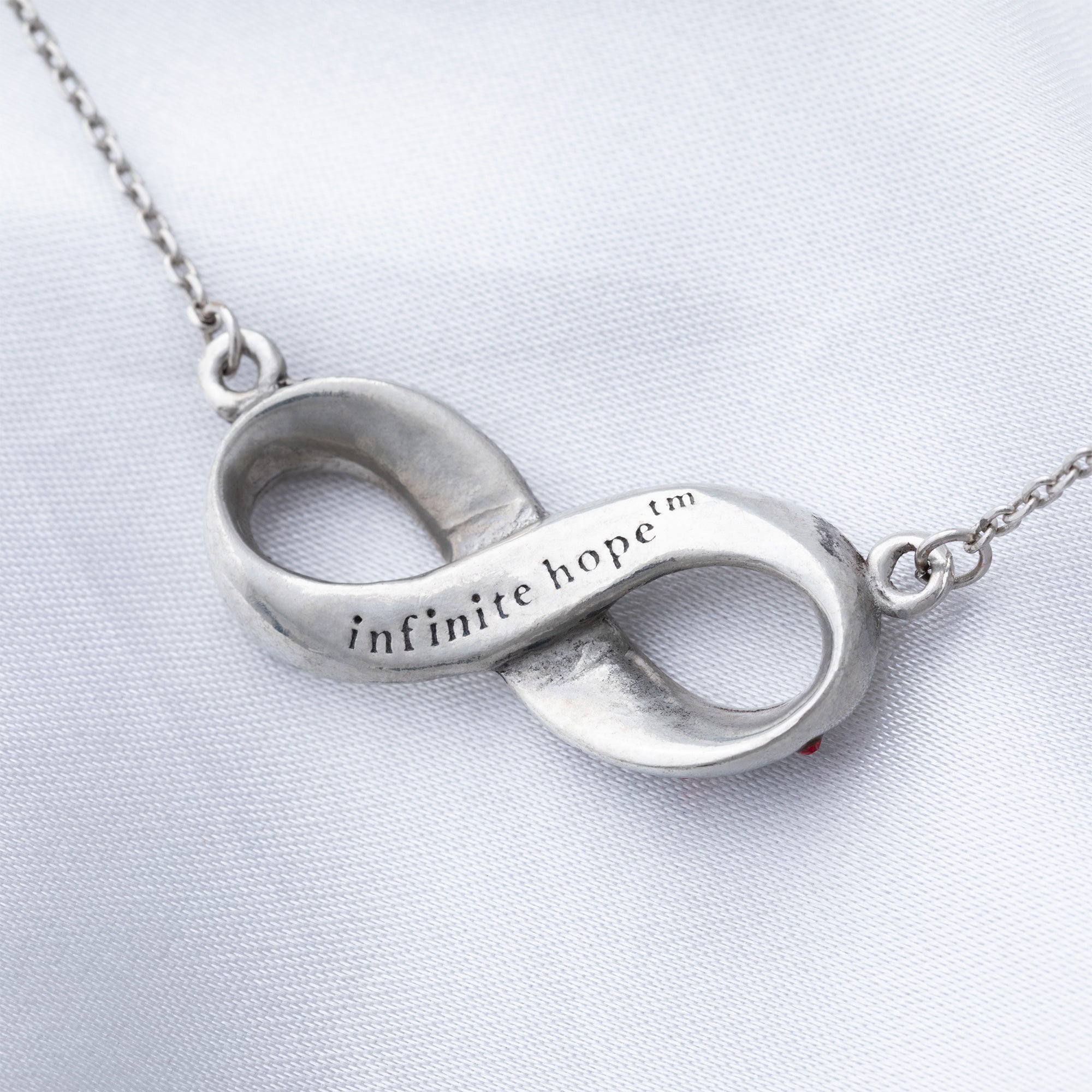 Share “Infinite Hope” with those living with diabetes. The front of our infinity pendant features a parade of ribbons with red crystal accents, while the back bears a message of inspiration for the cause.
