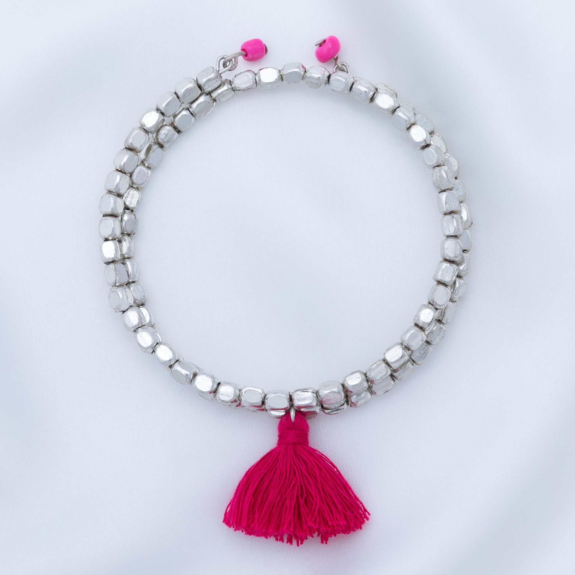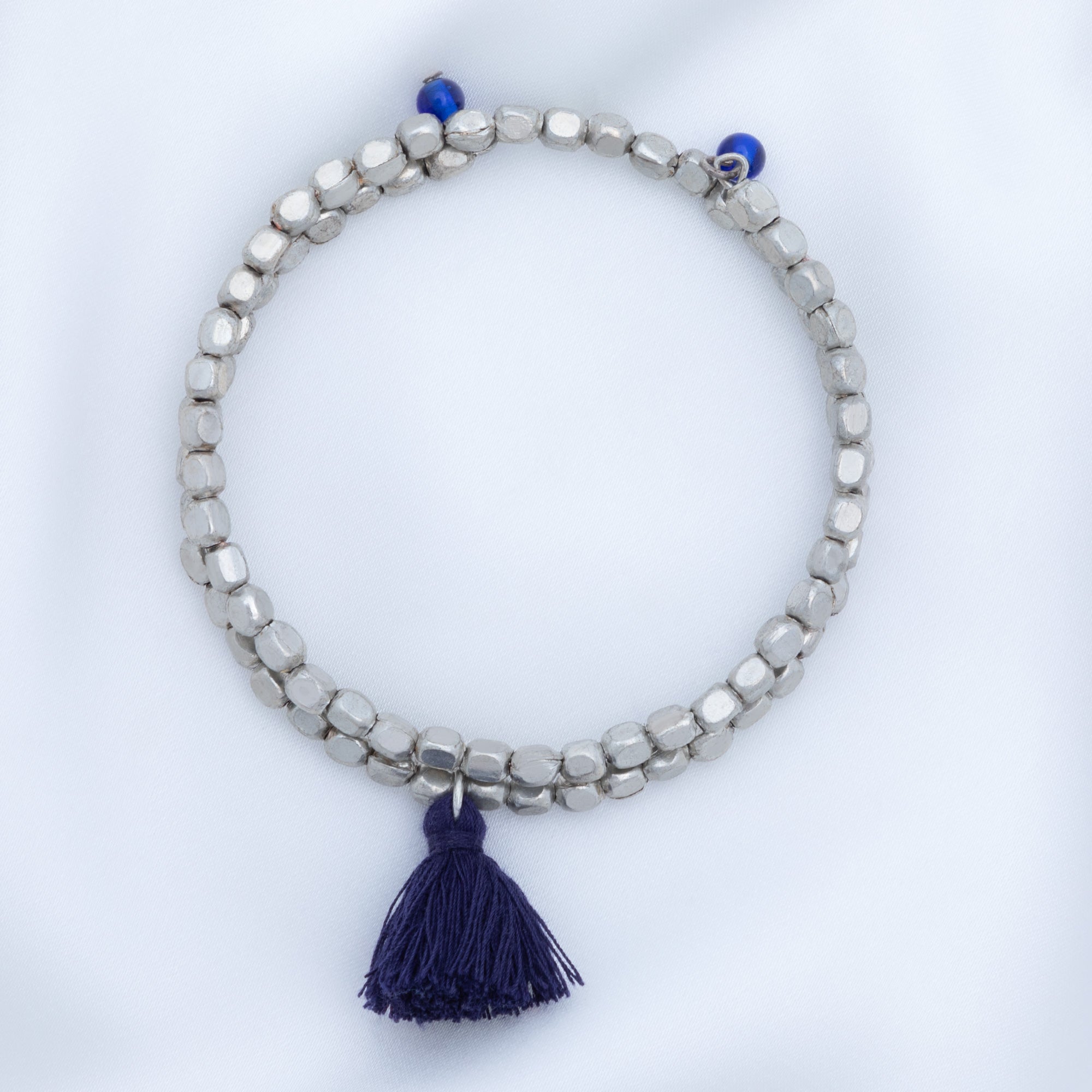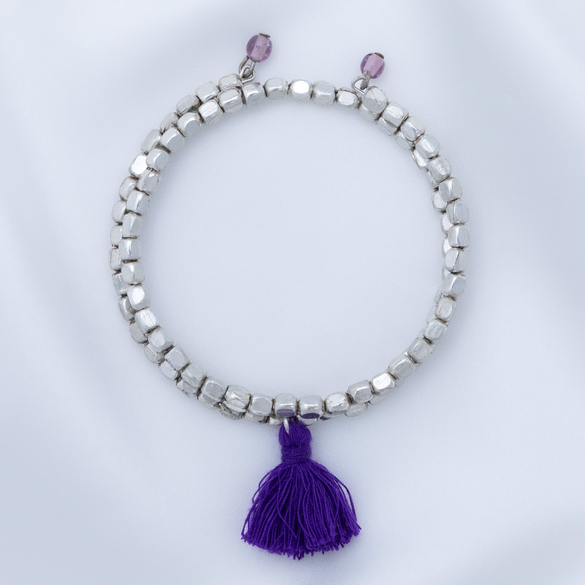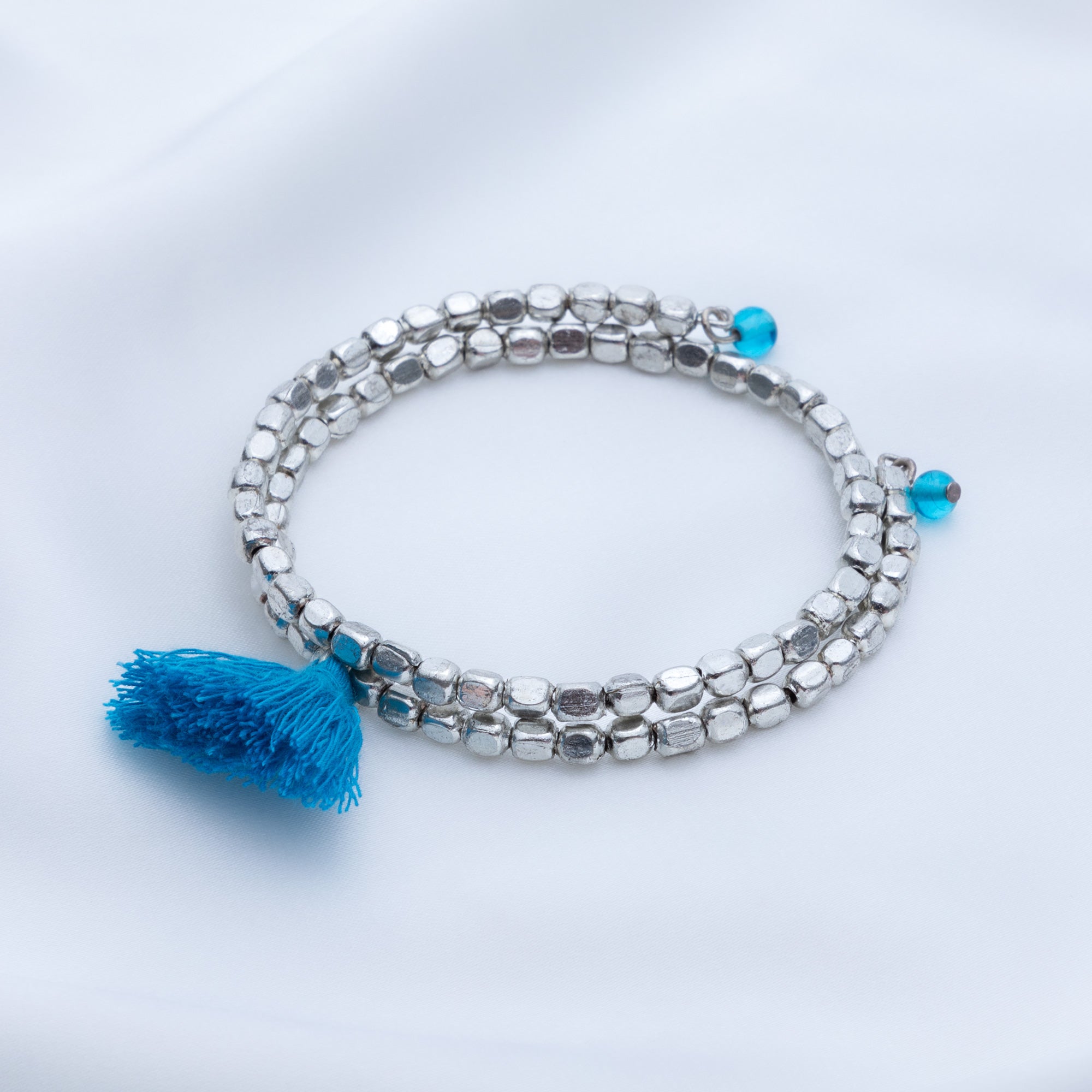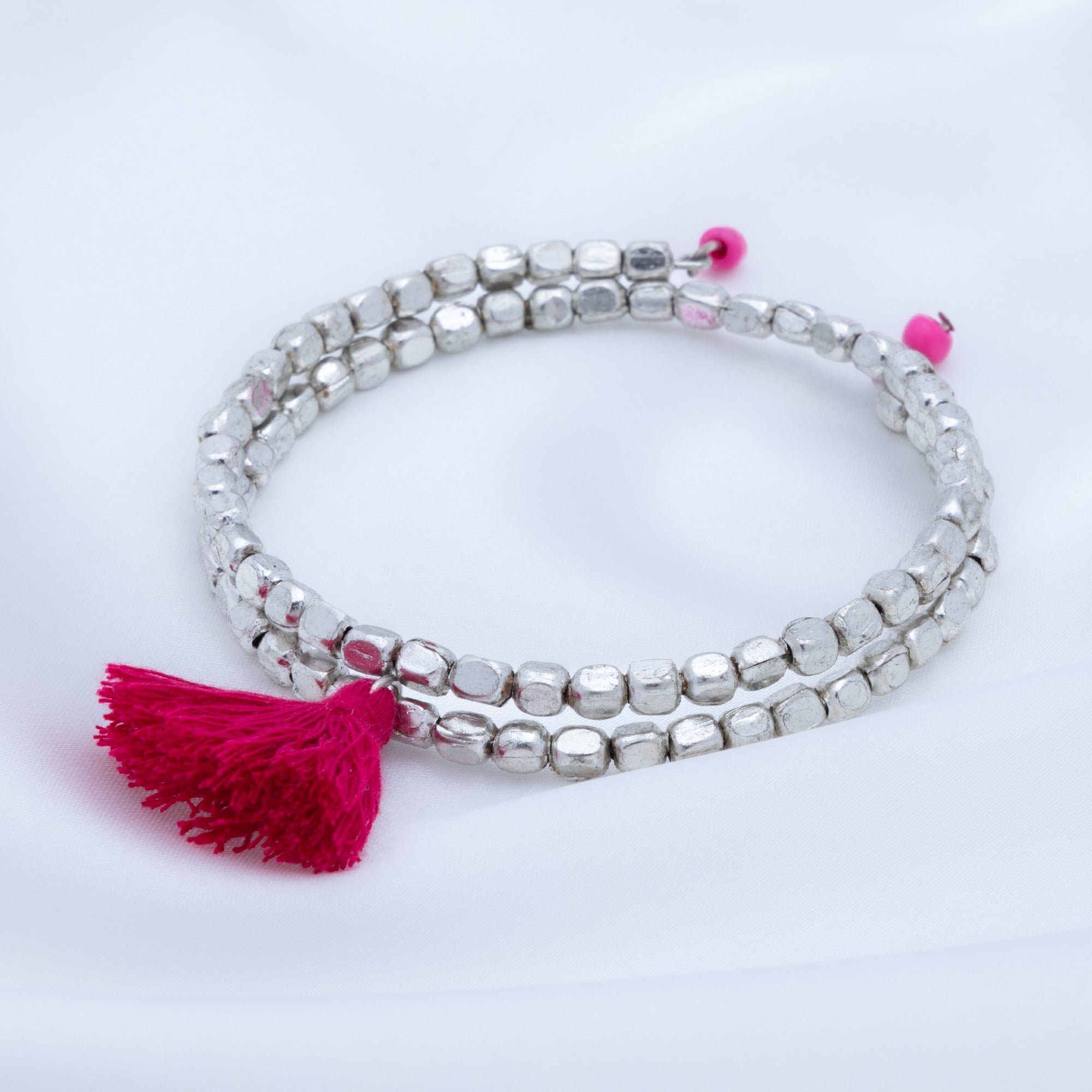A fun bohemian style with stunning silver-plated beads and brightly colored tassel accent, these once-around wrap bracelets are perfect for stacking. Each bracelet is handcrafted by skilled women jewelry artisans at Community Friendly Movement in a village just outside of Delhi, India.