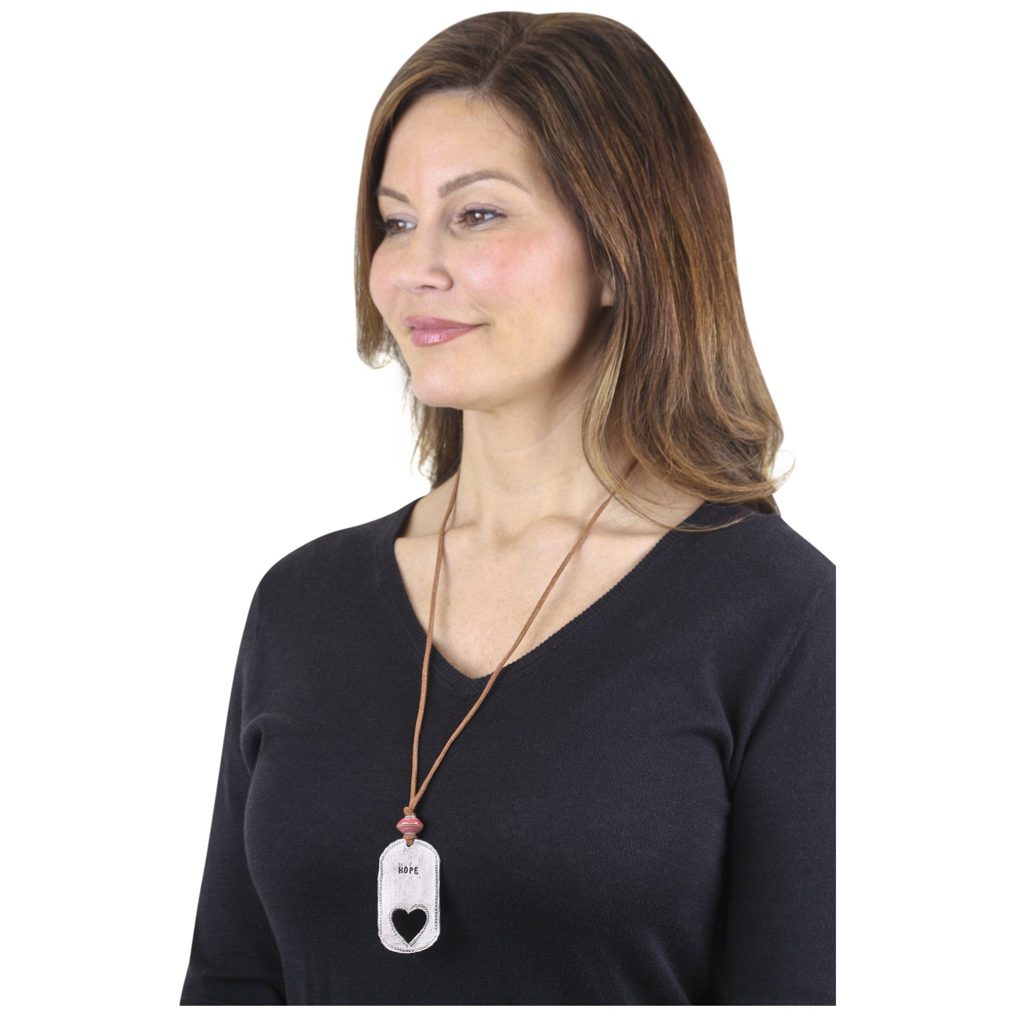 Share a message of hope for the people and communities in Haiti with a dog tag necklace made of metal recycled from oil drums, stamped with the word “Hope” and embellished with a heart-shaped cutout. Finished with a glass trade bead on a leather cord for a rustic touch.
