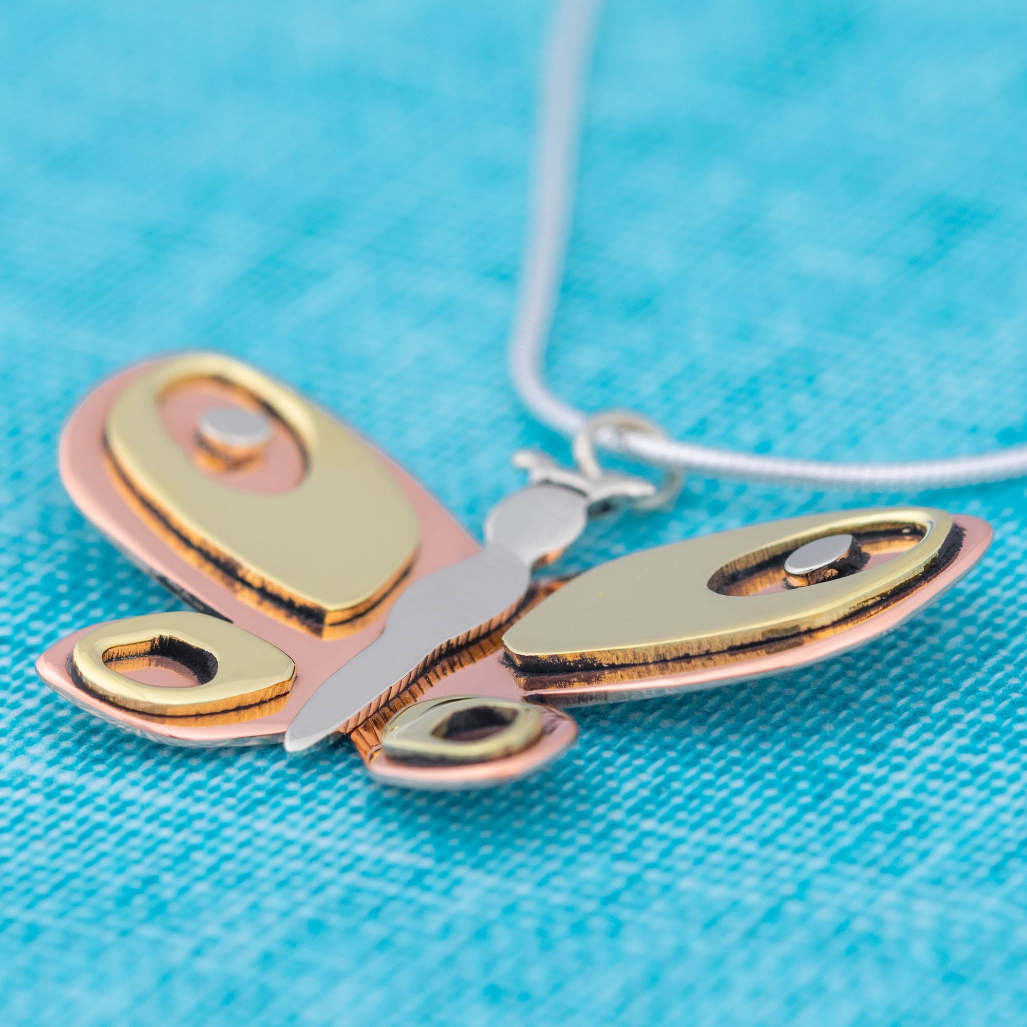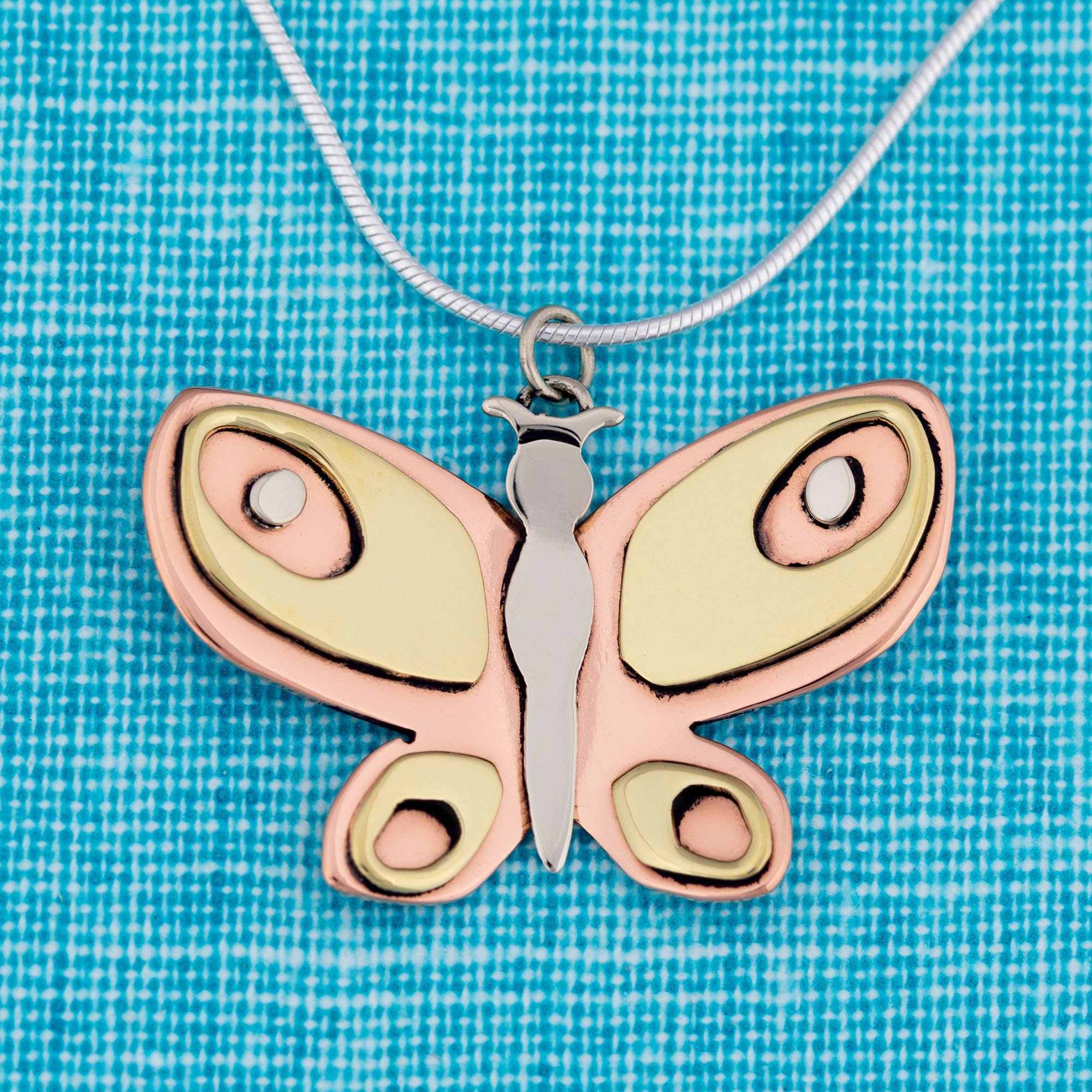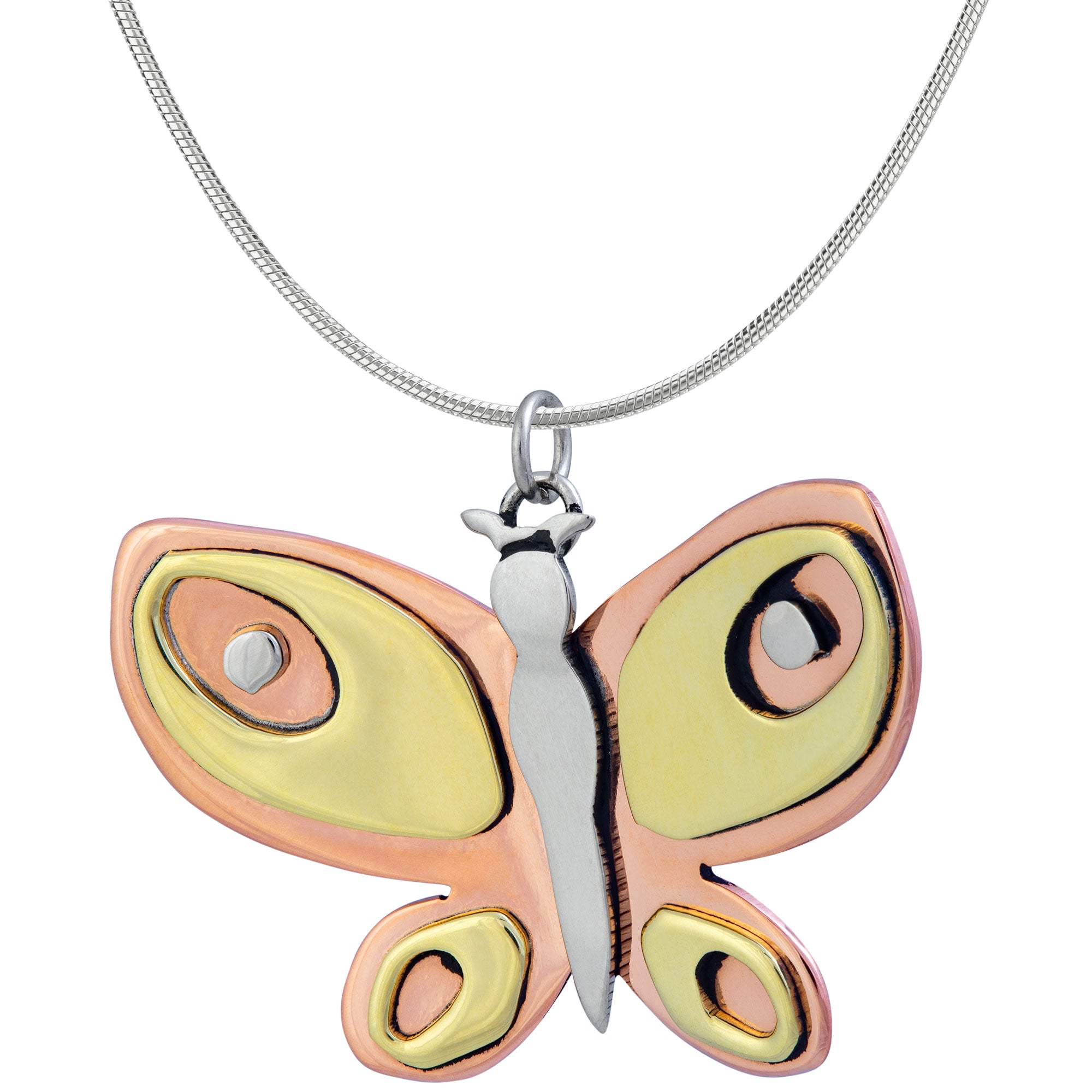 A beautiful blend of mixed metals create an eye-catching design on this handcrafted butterfly pendant! Handmade by artisans in Taxco, Mexico, this fluttering fair-trade piece elevates your look with emphasis on your love of nature.